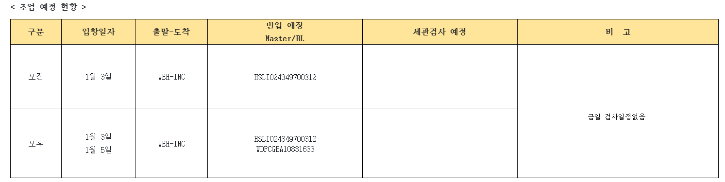1일 5일 입항건 일정표에 있으나 뒷순번 컨테이너는 익일 작업 될수도 있습니다 참고 부탁드립니다
