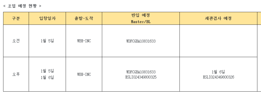 금일 6일 입항건 작업 예정표에 있으나