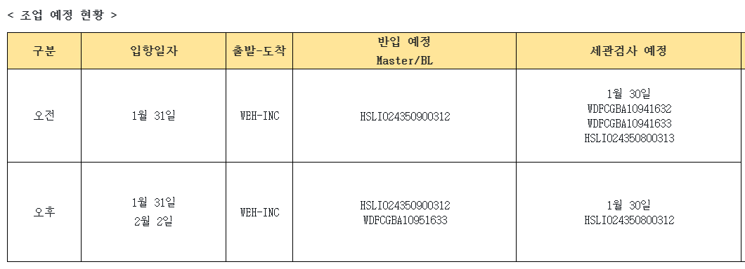 금일 어제에 이어서 30일 입항건 작업예정입니다