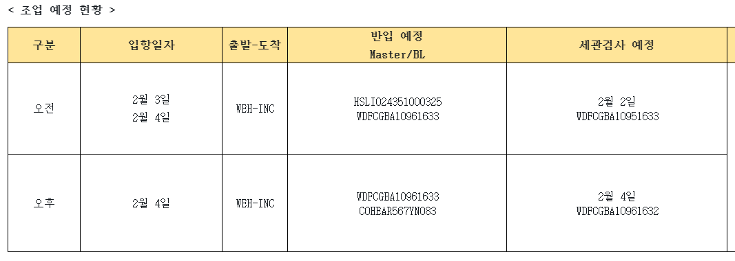 검사는 어제 작업한 31일 입항건과 2일 입항건 목록검사 예정입니다